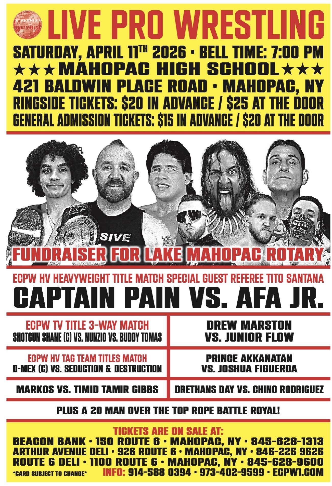 Tickets are now on sale for the Lake Mahopac Rotary Club's Second Annual East Coast Pro Wrestling fundraising event, featuring former WWE Stars NUNZIO and AFA Jr., along with WWE Hall of Famer TITO SANTANA.